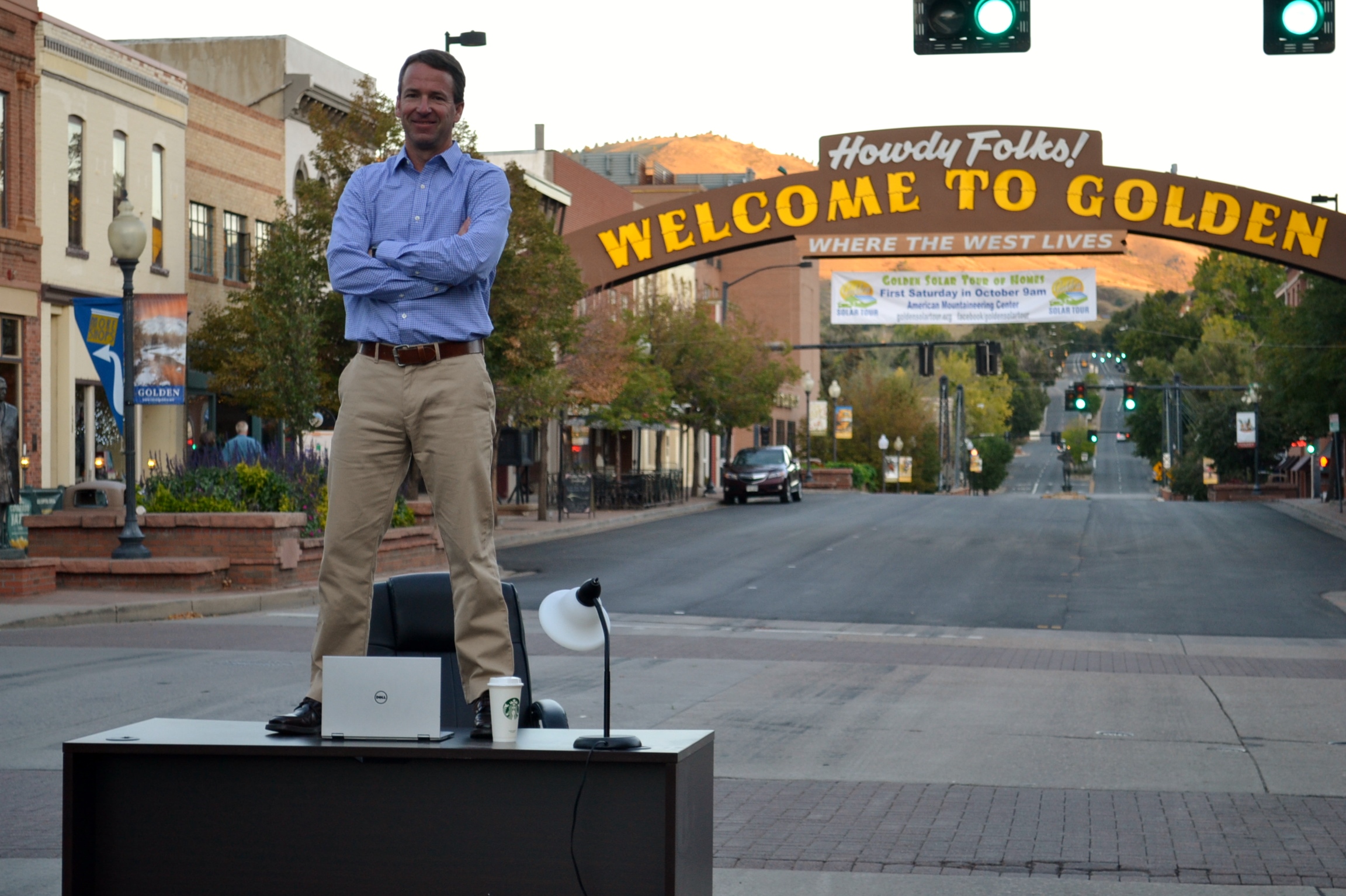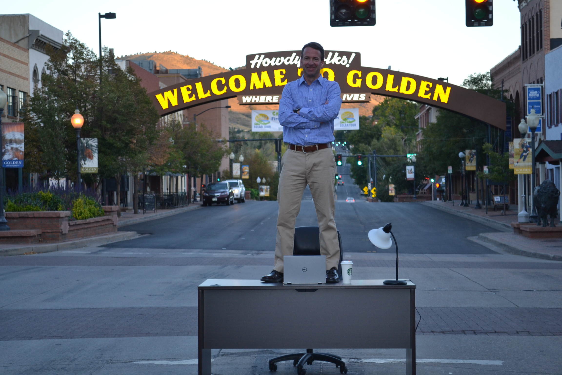 Many people have asked me about my Golden photo, and most are convinced that I just photo-shopped the picture. So I thought I would tell the story behind the story, with a few more added photos just to add to the fun. The short of it is this: It is real in every way, and I have people to back me up! We took the picture at 7:00 am on a Sunday morning in downtown Golden. My wife Leslie, and my good friend Dan Thoemke were my partners in crime. Dan and I moved the desk back and forth, and Leslie took the pics. The desk was heavy, the coffee cup empty, and the lamp and computer real. Yes, we had to move the desk several times, even at 7:00 am for moving cars, but even the cars had fun with it. There are a few other hints. Notice my puffy eyes because I am not a morning person! Also you can see the sun rising on the foothills behind the pic. Definitely morning. I am sure a true photo pro could give you more proof. They are legit!