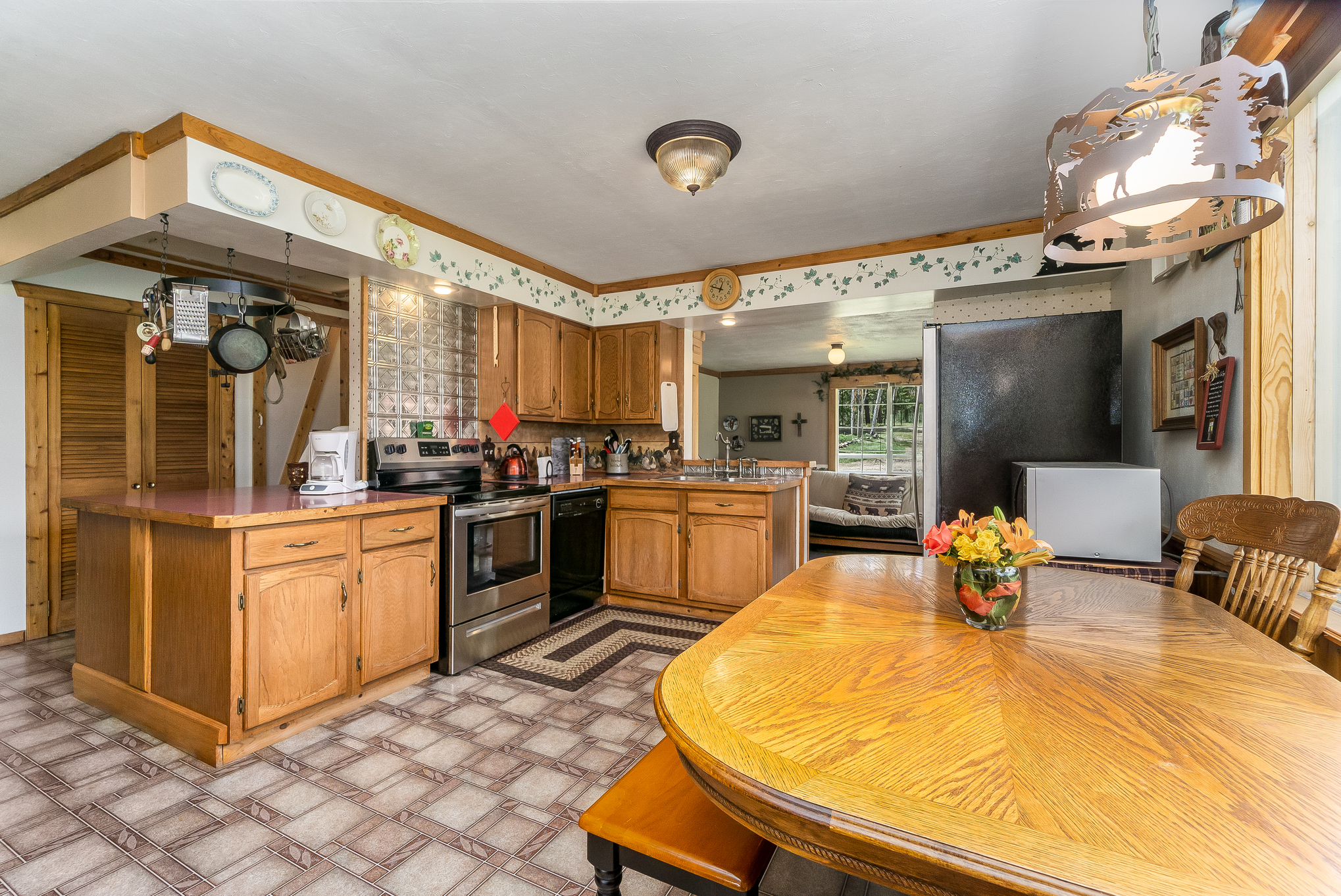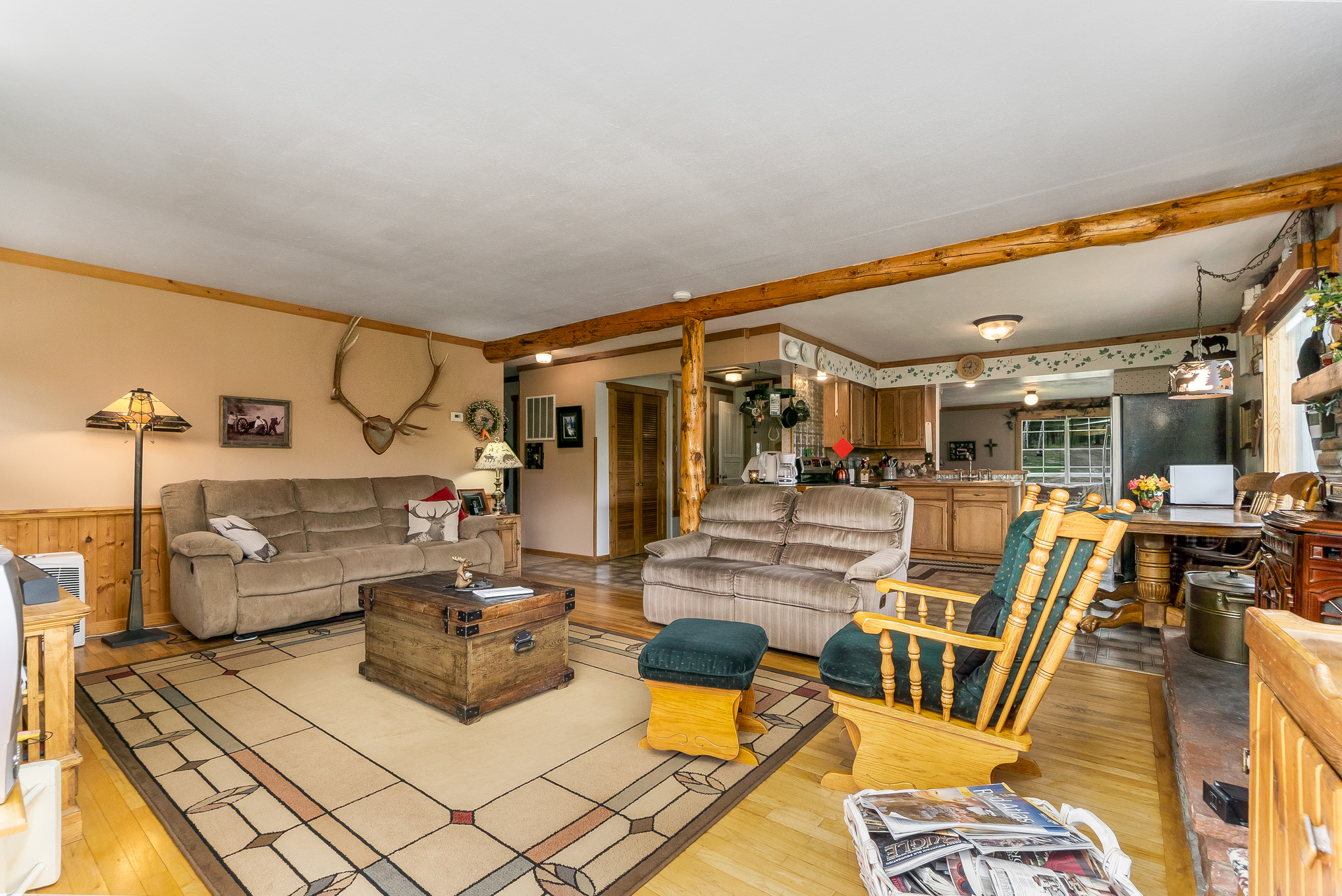 The home consists of custom woodwork and log accents, beautiful large windows overlooking the green pasture, cozy pellet stove, den/office space, and 3 separate outdoor patios for your viewing pleasure which include a pergola, covered front porch, and back deck retractable awning.