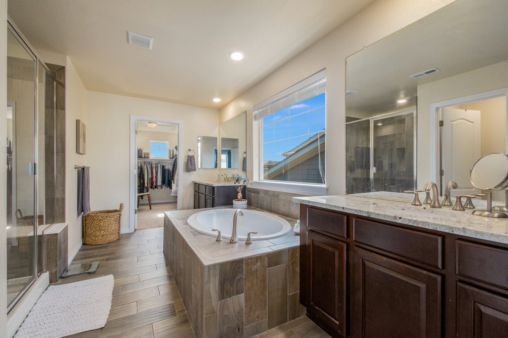 Upstairs you will find the main/master bedroom ~ bathroom suite, including a walk-in shower, granite countertops, two separate sinks, large oval tub and walk-in closets.