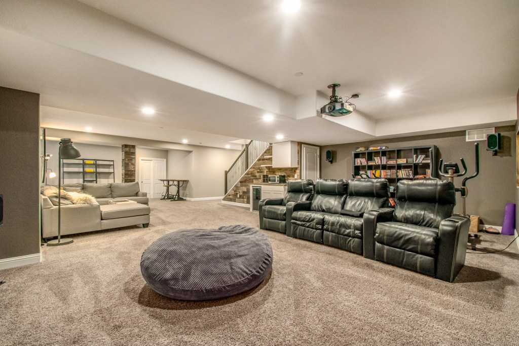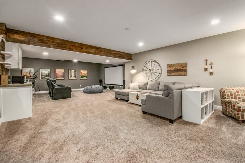 Two more bedrooms with a Jack and Jill bathroom, plus another bedroom with a private full bath complete the upper level. The custom finished basement includes a movie and rec room with barn wood accents and wine fridge.
