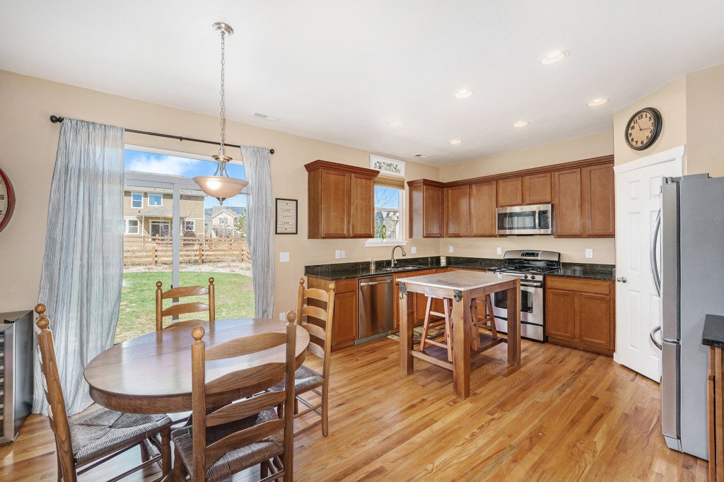 The main level has beautiful wood floors, updated kitchen with granite and stainless steel appliances, open kitchen living concept with natural light, extra dining area or living space and a half bath. Sliding door access opens right to the backyard from the dining/kitchen area.
