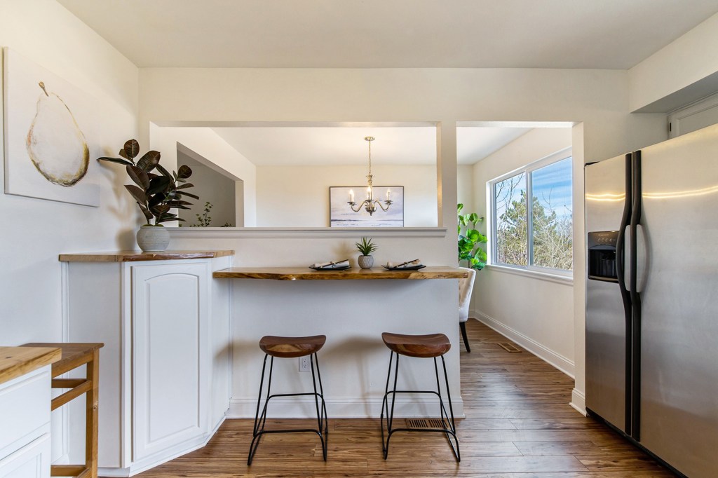 The kitchen has beautiful custom wood countertops, stainless appliances, a separate dining area and living area. These walls could likely be taken out to open up floor plan.