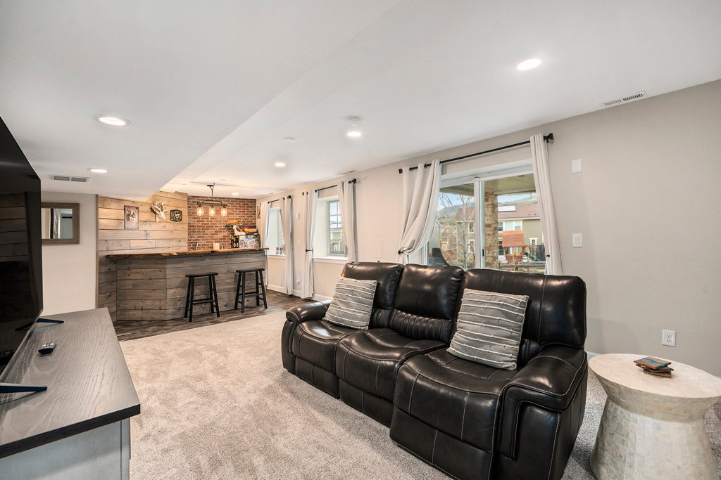 The inviting living area is highlighted by a cozy fireplace, abundant natural light, and easy access to a covered back deck — perfect for indoor-outdoor living.