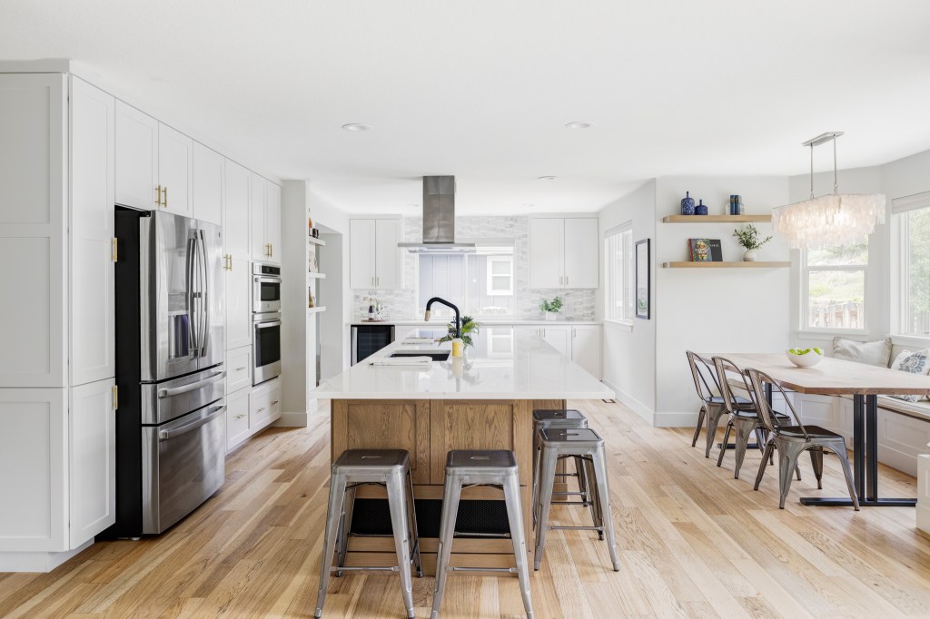 The home was extensively renovated in 2021, including a stunning high-end kitchen with quartz countertops, stainless steel appliances, induction cooktop, wine fridge, custom cabinetry, and a built-in dining nook.